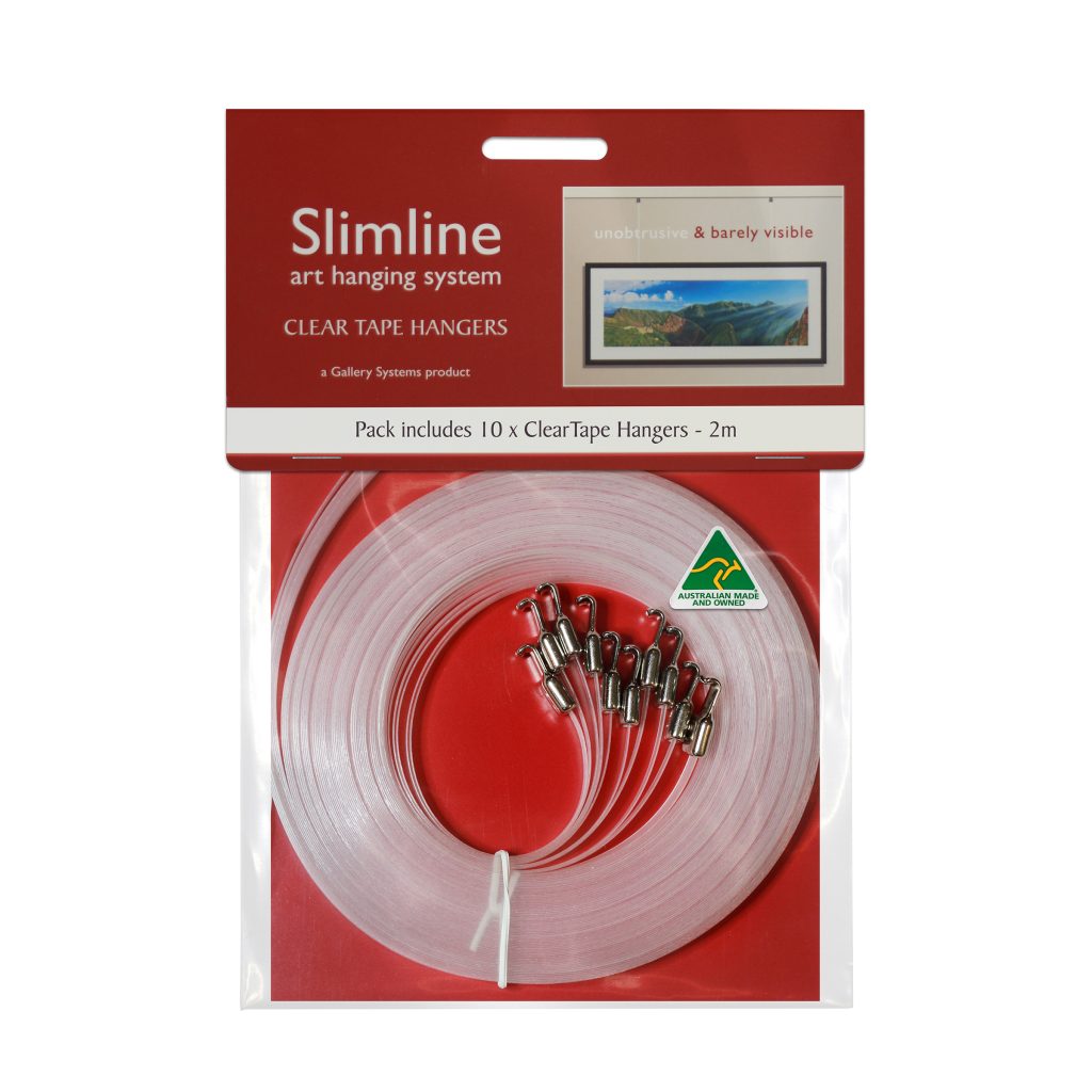 The Clear Tape Hanger pack contains 10 x 2m strong clear tape hangers. These hangers are only 6mm wide so quite unobtrusive and the most cost effective of all our systems. The flat tape offers advantages over other plastic hangers. Its wide area of grip means the hook won’t slip. The flat tape ensures that the hook always points outward ready to accept the picture.