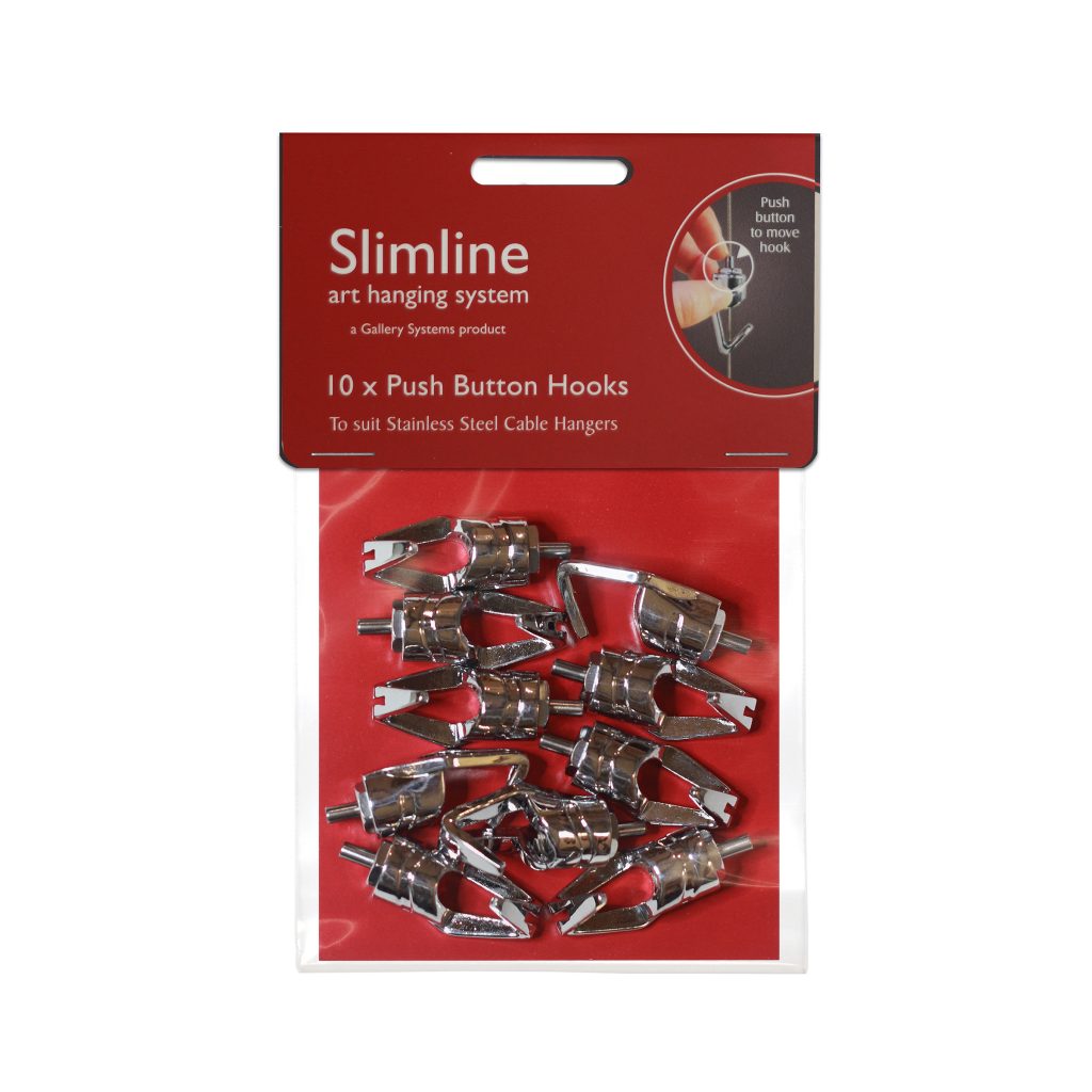 Tool-free operation; you simply push the button on top to move the hook to a new position. Suitable for use with Slimline Stainless Steel Hangers. Each pack comes with 10 x Slimline Push-Button Hooks.