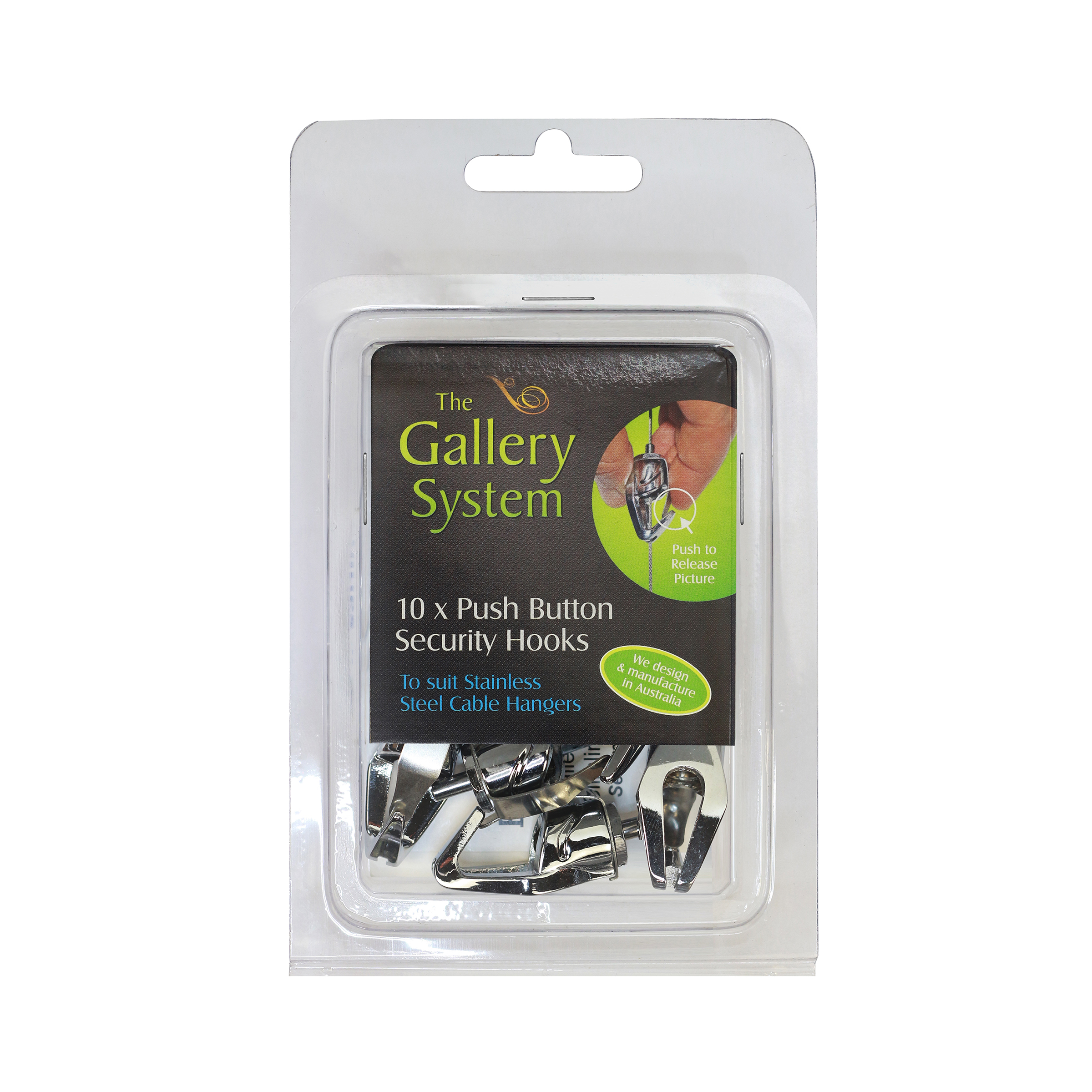 These hooks are sold in packs of 10 and suit the Gallery Stainless Cable Hangers,Traditional Picture Rail Hangers and our Slimline Stainless Cable Hangers.